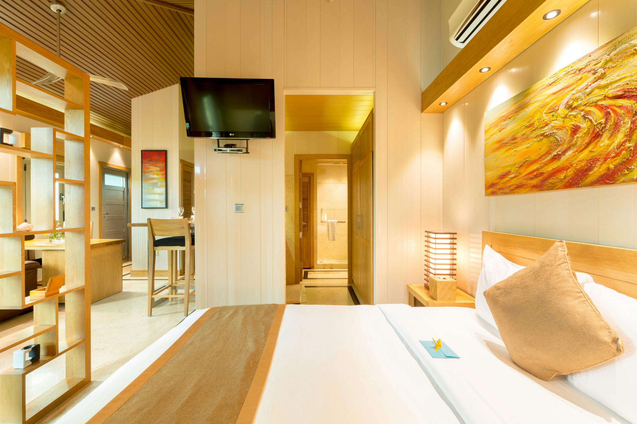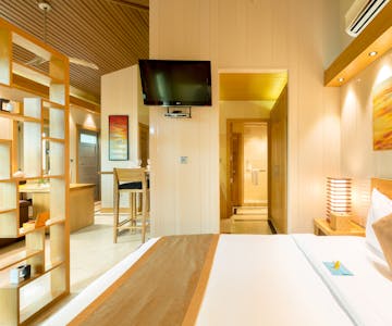 Contemporary Suite with full modern kitchen, bathroom and areas for dining, sitting and a work desk.